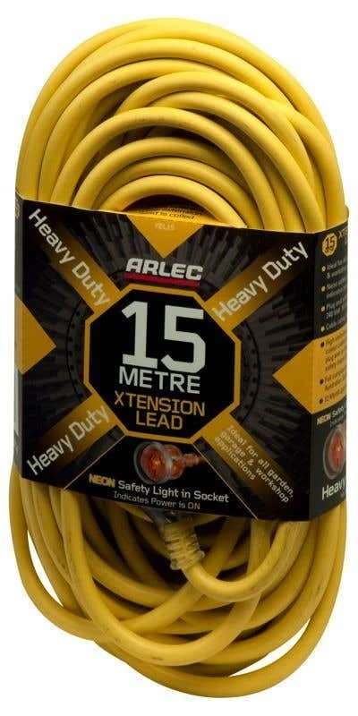 Arlec’s heavy-duty extension lead provides extra length for your power tools, garden, and workshop equipment. An additional 15 metre of lead gives you the flexibility to use your tools further from the power source. The wire size is a good heavy-duty PVC cable rated at 10 amps. The plug and socket are fully moulded with a clear cover allowing safety inspection of the connection point. The neon indicator light on the extension lead indicates power on and a high visibility yellow lead increases safety on site.