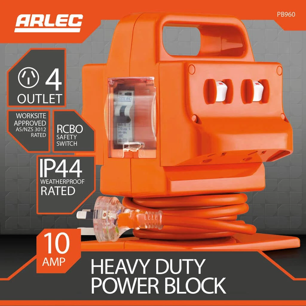 Power up your construction tools with Arlec’s heavy-duty power block safety switch. The four double poles on/off switches allow you to power up multiple tools at once, and a weatherproof IP44 rating ensures it can be used in all weather conditions. Its heavy-duty construction makes this 240V cord a must for any home or project site.