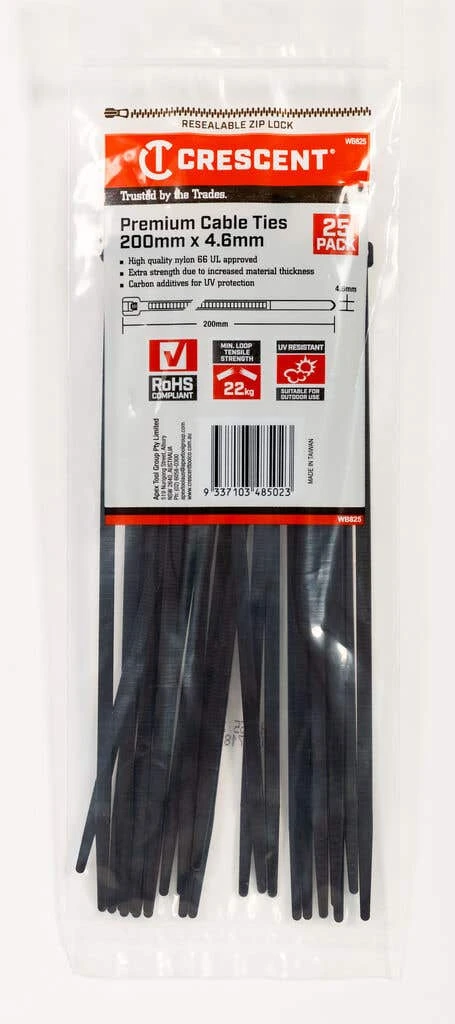 Crescent Cable Ties are high-quality, self-locking nylon cable ties that come packaged in a handy, resealable zip lock bag. Available in a range of colours and sizes, these nylon UL-approved cable ties are resistant to most chemical acids and are ideal for use in the home, office or workshop.
