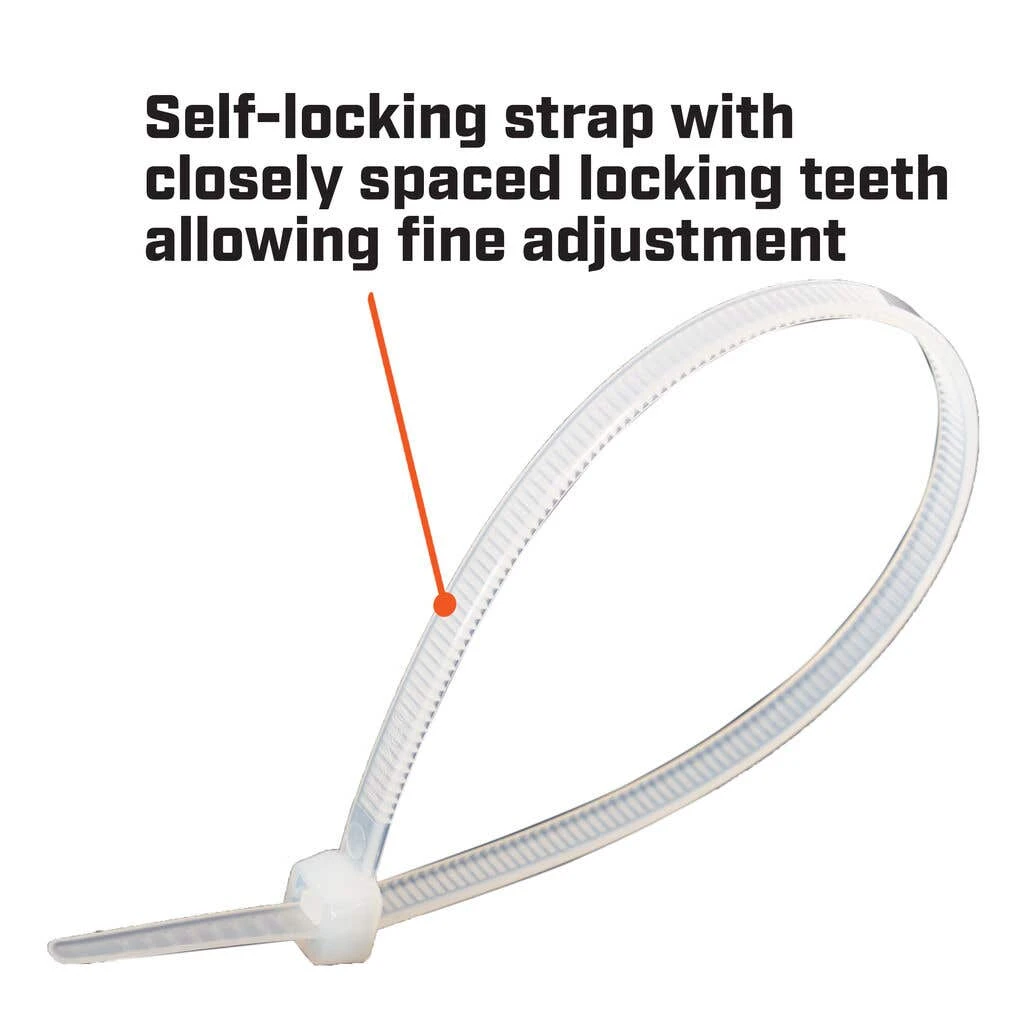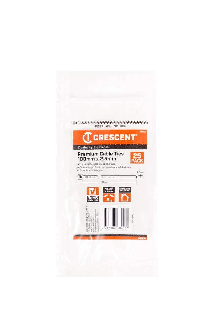 Crescent Cable Ties are high-quality, self-locking nylon cable ties that come packaged in a handy, resealable zip lock bag. Crescent Natural Cable Ties are nylon UL-approved cable ties that are resistant to most chemical acids and are ideal for use in the home, office, or workshop.
