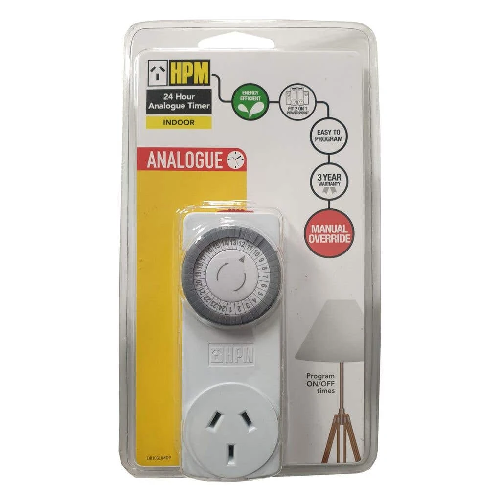 The HPM 24 hour analogue plug in timer allows you to automate devices like lamps, seasonal lighting and portable fans to cut down on both energy use and bills. This timer is programmable on a daily cycle and can be set in 30-minute increments. It is designed to be easy to set and has an override switch for control of the outlet.