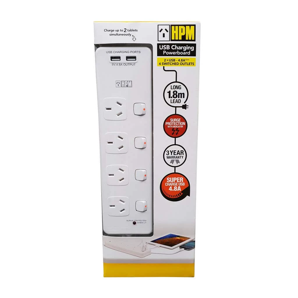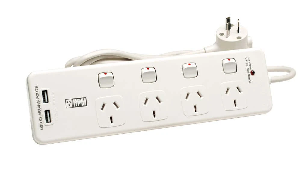 The HPM 4 outlet USB charging powerboard is the perfect way to charge all of your devices at once. With 2 USB outlets, you can easily plug in your USB cords straight into the powerboard, and charge up to 2 tablets simultaneously. The slimline design takes up minimal space, and the individually switched outlets allow you to switch off unused outlets, and safely interchange appliances by switching them off before changing them.