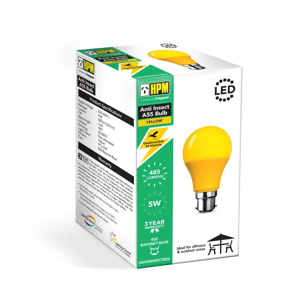 The HPM B22 LED 5W Anti Insect A55 Bulb is perfect for keeping pesky insects at bay. The bulb features a unique anti-insect coating that emits a light frequency that repels insects, making it ideal for use in outdoor areas such as patios, porches, and gardens. This bulb can be used in outdoor areas such as alfresco dining areas or patios without having to worry about attracting insects. At 5 watts, this LED bulb is highly energy-efficient, consuming up to 80% less energy than a traditional incandescent bulb, resulting in significant cost savings on your energy bills.