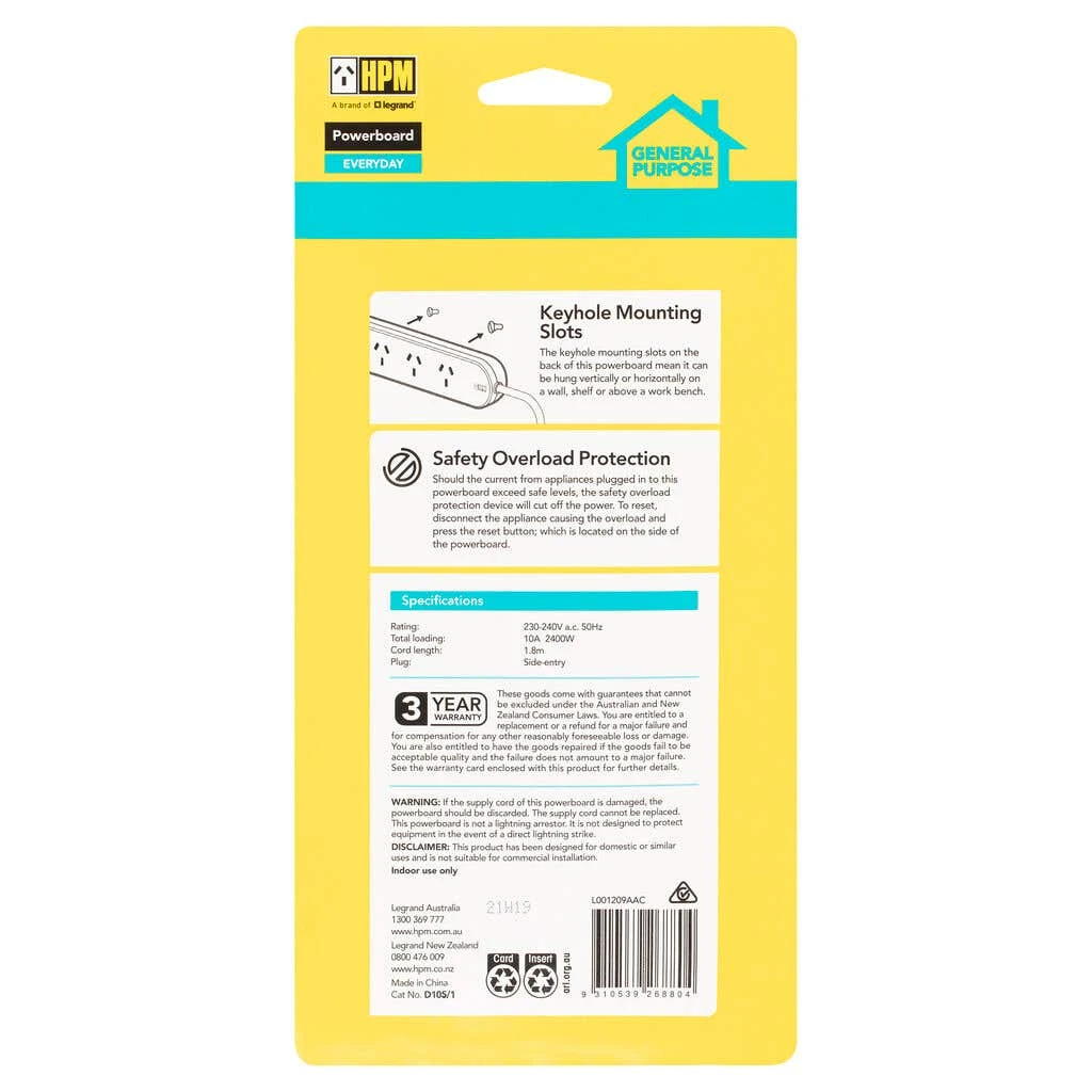 This HPM General Purpose 4 Outlet Powerboard is perfect for any general use. With a longer 1.8m lead length, providing more flexibility in positioning. Whether you’re using it at home or in the office, this powerboard will get the job done. With its keyhole mounting slots, the powerboard can be hung vertically or horizontally. It also features side entry plugs to avoid tangling. Safety overload protection and long 1.8m lead make this item ideal for connecting your desk lamps, laptops, and other electrical devices.