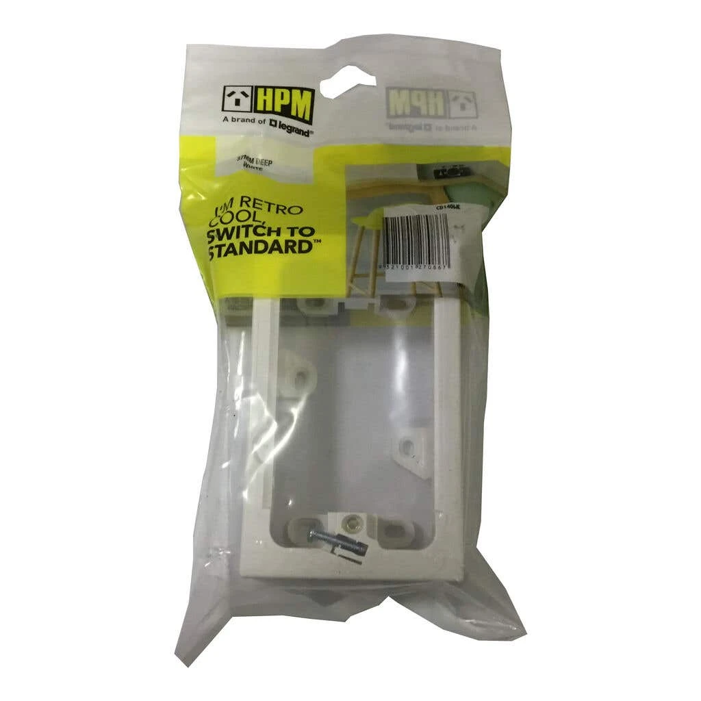 HPM Surface Mounting Block White 37mm is a hard plastic surface mounting block and fits powerpoints, switches and electronic mechanisms. The 37mm deep White Surface Mounting Block is designed to suit power points, switches and electronic mechanisms. Made of hard plastic, it features multiple snap-out entries for cable or conduit. It’s great for residential or commercial applications and comes with screws. This handy product is a great everyday tool for any electrician.