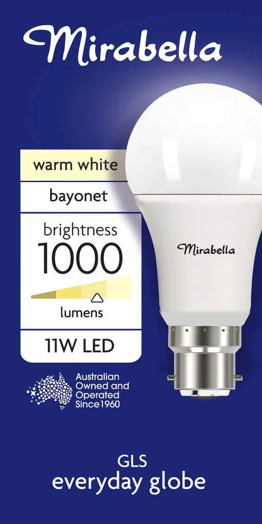 Add some classic style to your home or office with the Mirabella 11W LED GLS Everyday Globe Bayonet Warm White. Professional-looking LED GLS light globe is suitable for many applications for commercial or residential use. Costs less to run than normal Halogen globes and offers a longer lifespan than most bulbs, making it an economically sensible choice and a great investment. Long-lasting 1000 lumens 11W LED in GLS shape globe with Bayonet cap fitting.
