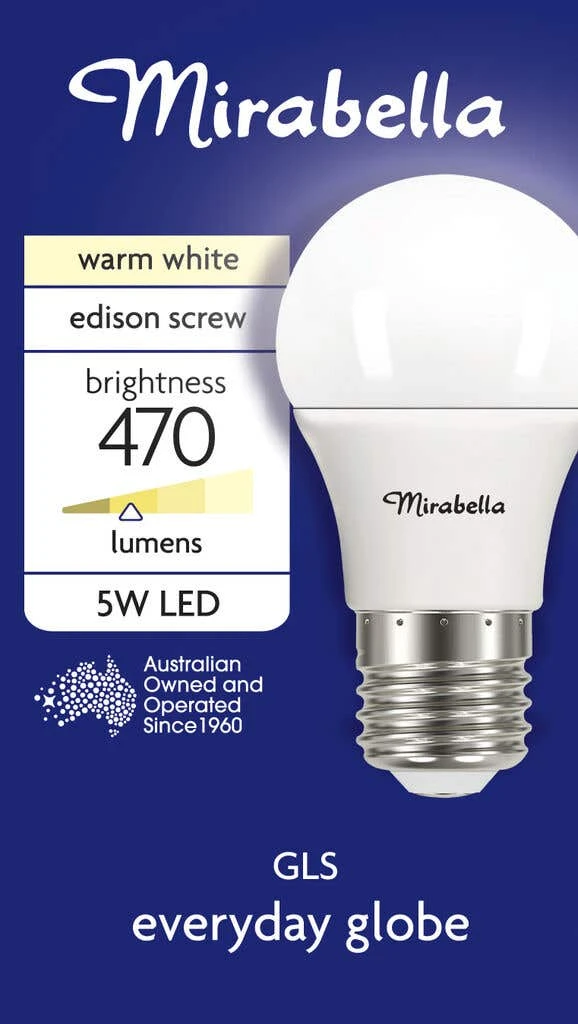 Add some classic style to your home or office with the Mirabella 5W LED GLS Everyday Globe Edison Screw Warm White. Professional-looking LED GLS light globe is suitable for many applications for commercial or residential use. Costs less to run than normal Halogen globes and offers a longer lifespan than most bulbs, making it an economically sensible choice and a great investment. Long-lasting 470 lumens 5W LED in GLS shape globe with an Edison Screw cap fitting