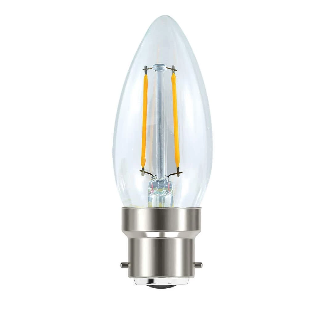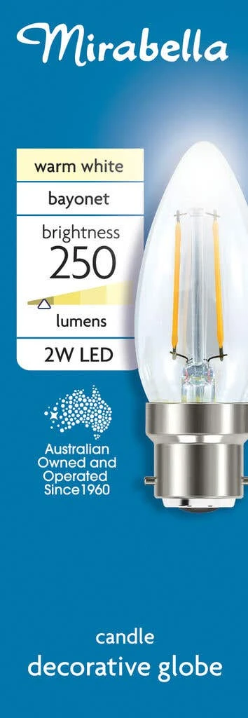 Mirabella LED Globe Filament Candle 2W BC Warm White is a long lasting technology that is durable and cost less to run compared to halogen. This product is a single pack candle with Bayonet cap. This Bayonet candle decorative globe is a warm white colour, with 250 lumens and a 2W LED globe. It has an Australian owned and operated company since 1960, and is highly recommended by the market.