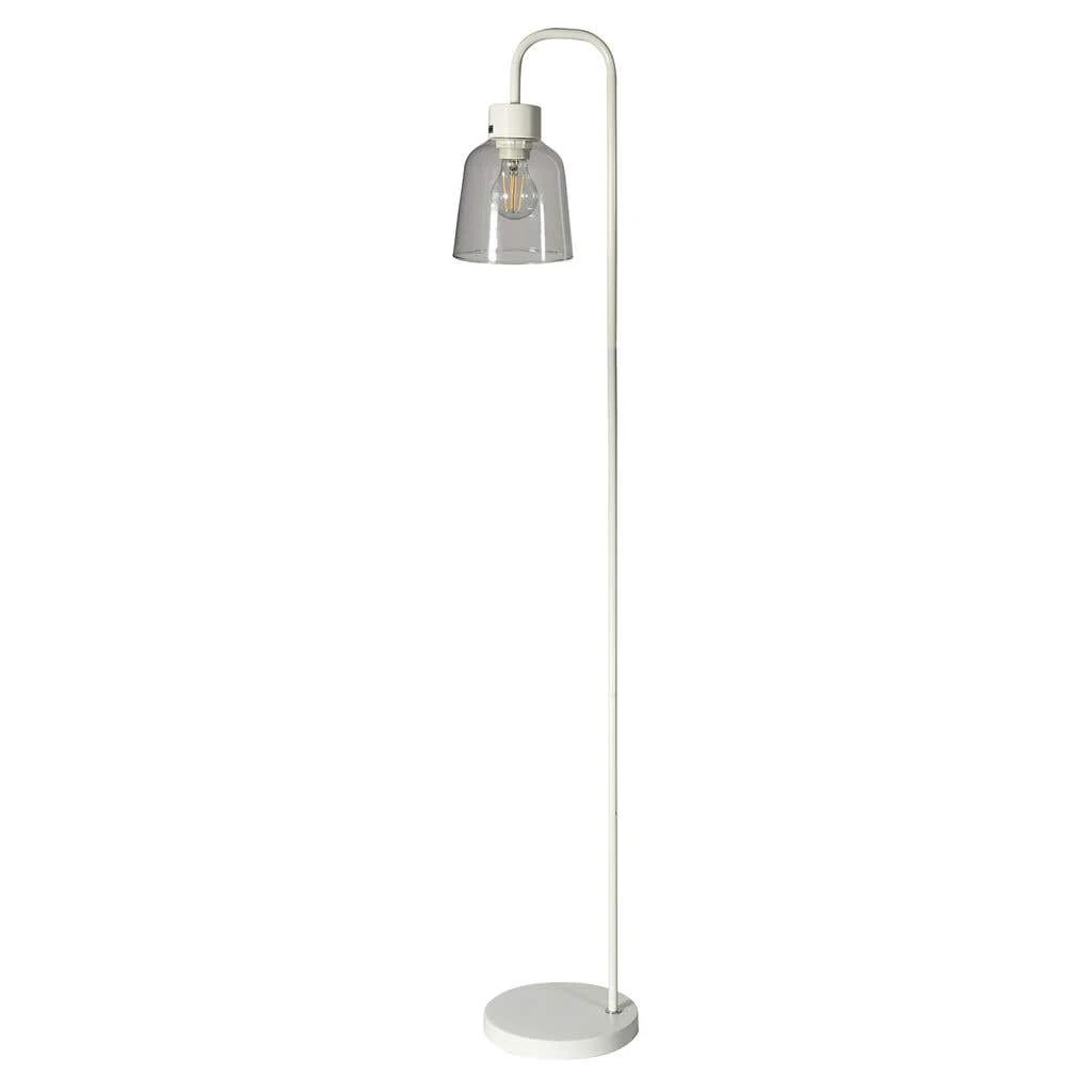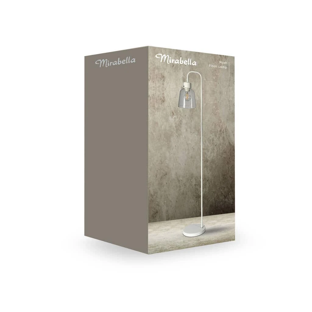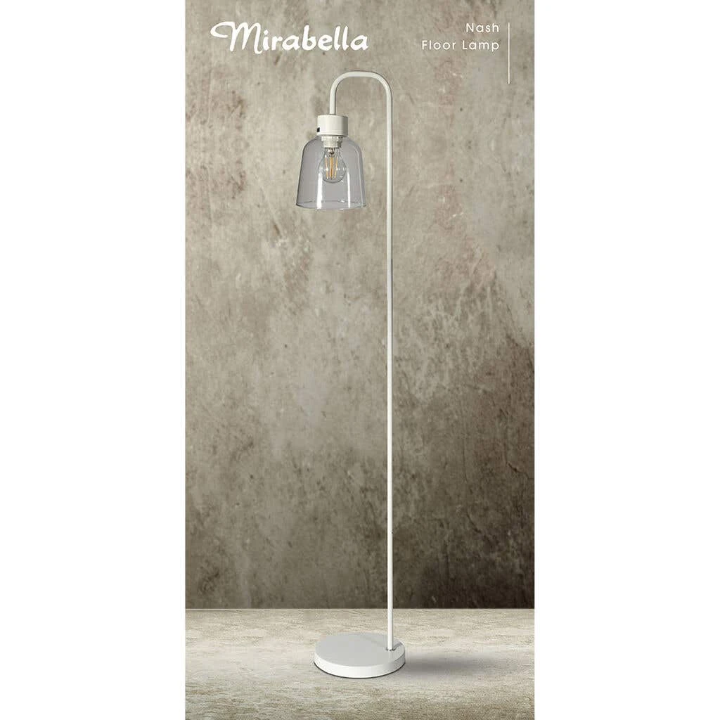 Brighten up your living space with the Mirabella Nash Floor Lamp. This modern lamp features a clear glass shade and a metal frame. This classic floor lamp features a clear glass shade, matte white metal body and base and an on/off switch and provides directional lighting to an area of space. This stylish floor lamp will easily complement any existing decor. Add your desired light globe based on the lighting ambience you are looking for. This lamp works well with recommended globe 5W LED E27 (not included).Â