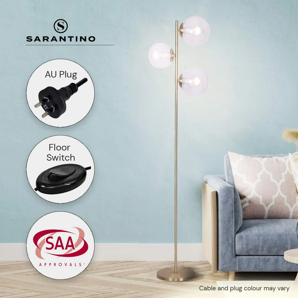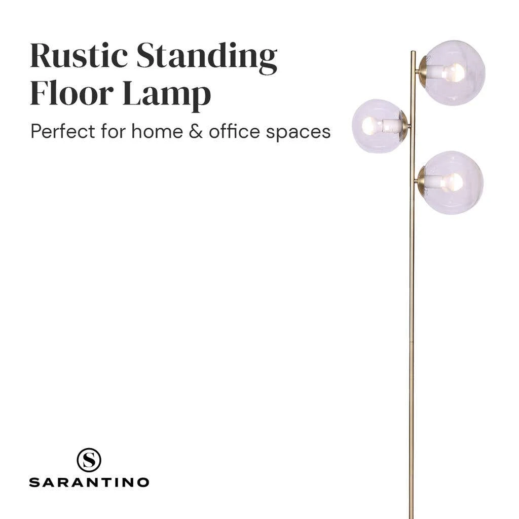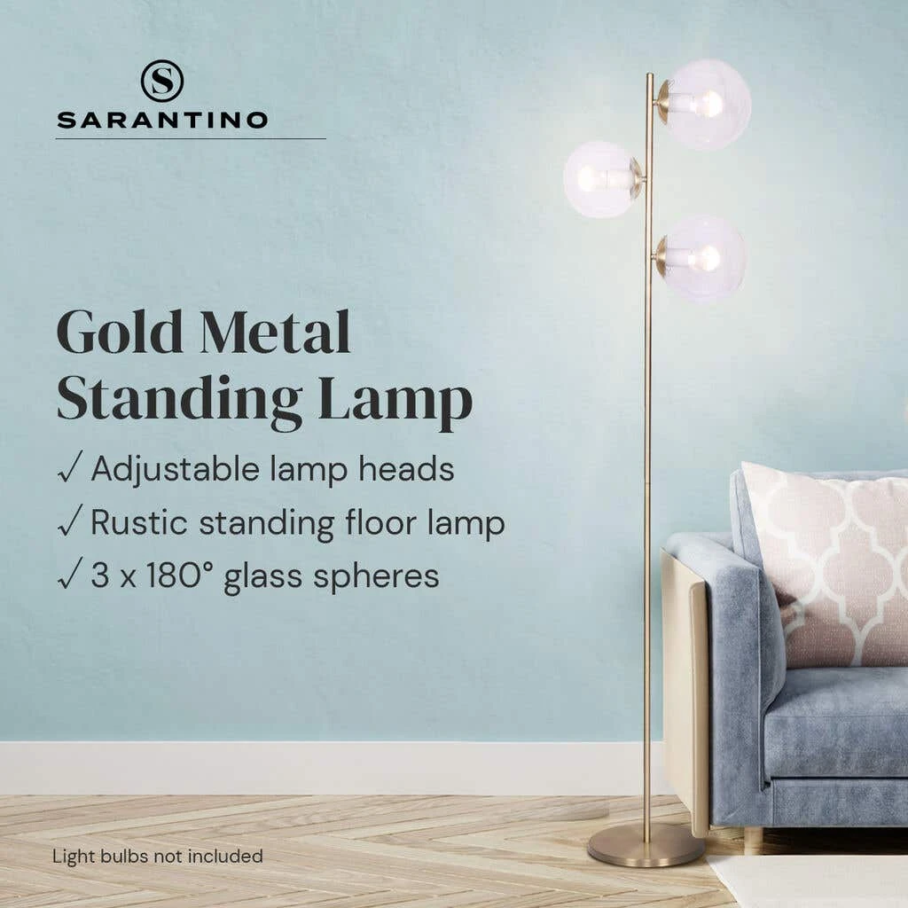 This elegant metal floor lamp construction complements different furnishing styles and is suitable for living rooms, bedrooms, offices, dining rooms, corners and other indoor living environments. Sarantino 3-Light Gold Metal Floor Lamp with Glass Shades is unique and bright, with three lamp heads featuring stylish glass shades. Easy to operate, with a convenient step-on switch attached for simple on/off access.