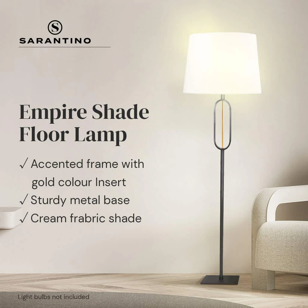 Sarantino Classic Floor Lamp with Empire Shade is featuring a durable post and fabric lampshade, this American-style floor lamp adds a touch of elegance and fashion to your home. It can be used as a bedside lamp, night lamp, reading lamp and a stunning decor piece. The post is accented by an oval-shaped ring with a gold rod in the middle. This lamp has a fabric shade to filter strong light and create a warm, relaxing and comfortable atmosphere. With the sturdy metal base, you do not need to worry about this lamp tipping over. It is simple yet stylish, making it an excellent lighting fixture or decoration for any room in your home. In addition, this lamp makes for a beautiful gift no matter the occasion.