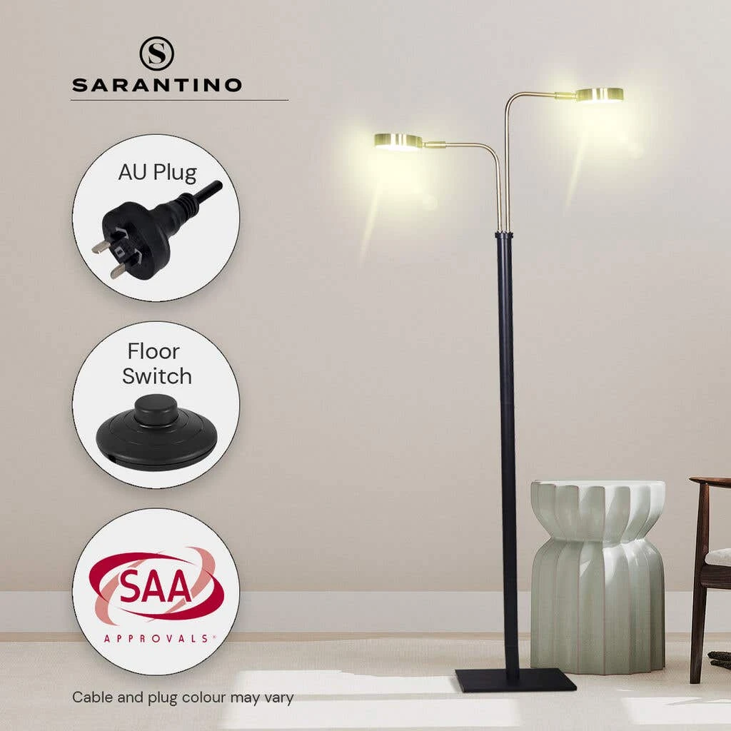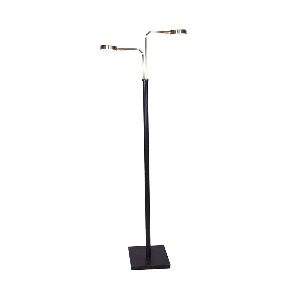 A twist on the classic task lamp, this floor lamp is as versatile as it is stylish. It has two 5-watt LED lights that can be adjusted to your preferred direction. Face one towards your desk for focused task lighting and let the other fill the room with bright, ambient light. Or, set both shades to one direction for an extra boost of brightness. With its energy-efficient lights, this piece will work beautifully as a bedside or reading lamp. The black metal base and brushed gold arms contrast with each other to create a refreshing, modern design.