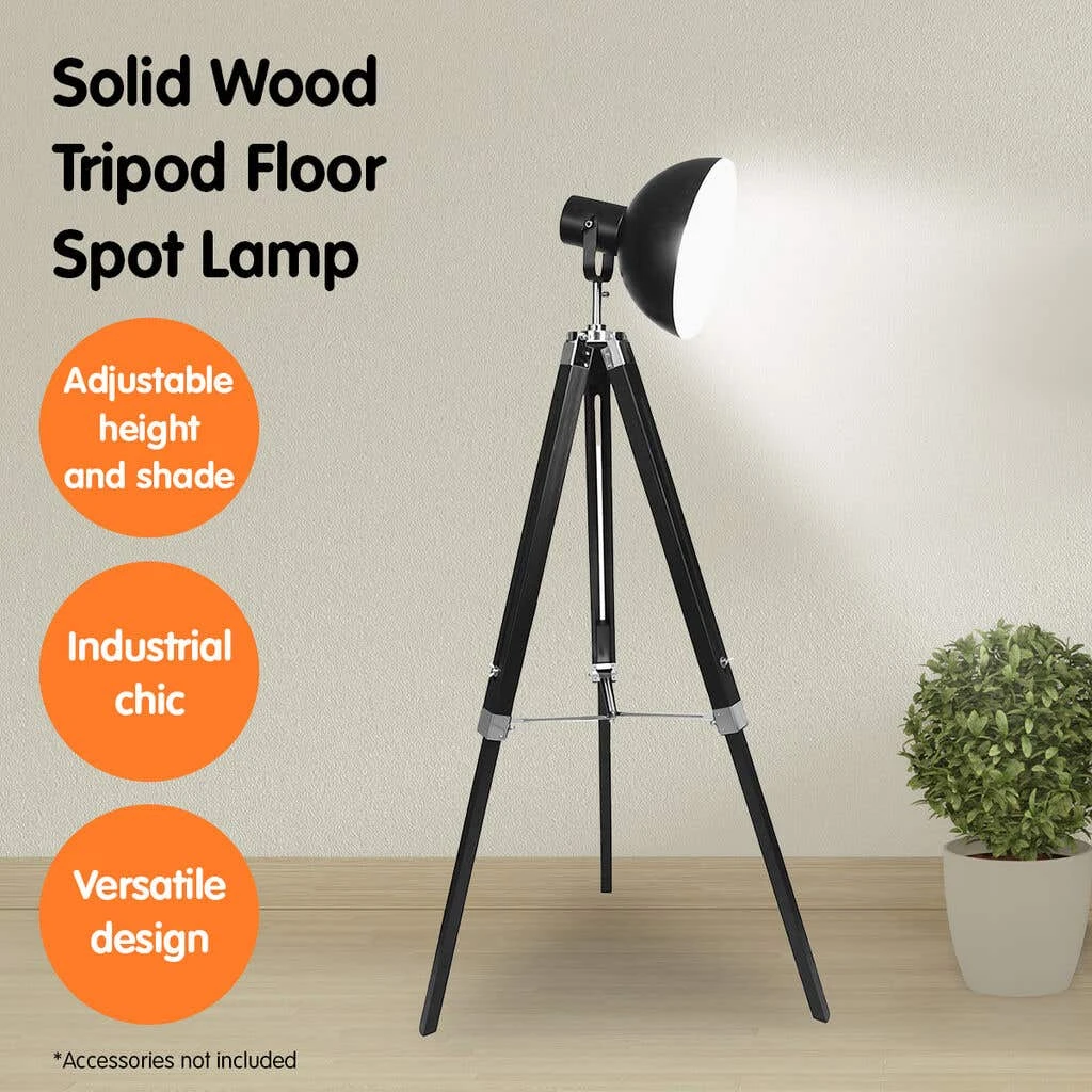 This stunning floor lamp is perfect for adding style and illumination to any space. Sarantino Tripod Floor Spot Lamp Reading Adjustable Height Metal all-black design suits industrial, minimalist, and vintage interiors, and is assured to complement modern decor. The tripod is made of solid wood and can be raised or lowered to your preferred height. The metal dome shade casts a wide light, making this floor lamp ideal for lighting up bigger areas. Silver metal fittings complete the look and give the spot lamp its luxe modern feel. This tripod floor lamp has an E27 globe base (globe not included) for quick and easy installation.