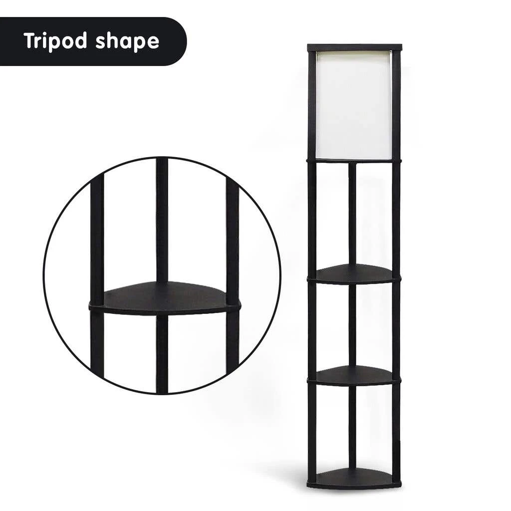 Brighten up your home, dorm room, or office with our tripod shelf floor lamp. Its rounded triangle shape makes it ideal for dressing up bare corners or for use as a combination bedside table and lamp. This wooden floor lamp comes in an attractive black shade and has 3 sturdy shelves for storage and display. Add a refreshing touch with a houseplant, or show off your personality with your favourite decor, photos, and books. The floor lamp can be fitted with any 60-watt E27 light globe, so you can create the perfect mood for your space. It also has a fabric shade that gently diffuses light, giving you a softer and more inviting glow.
