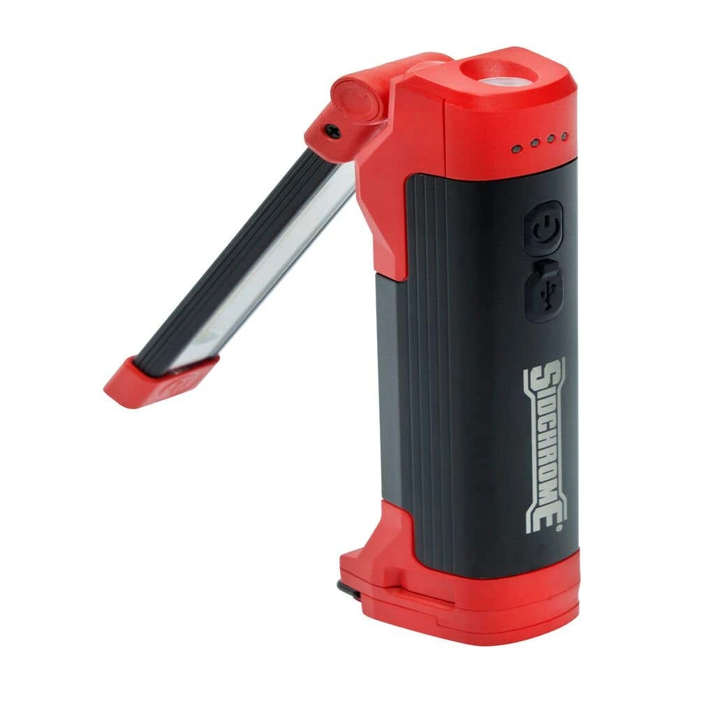 The rechargeable articulating work light features a slimline bar with 180 degrees angle and swivel movement and includes 3 versatile light modes: Floodlight (400 lumens), Flashlight (150 lumens), and Top Light (50 lumens). Designed for the job site, workshop or garage, it is compact and lightweight and ideal for inspecting engine bays, fuse boxes, and even .