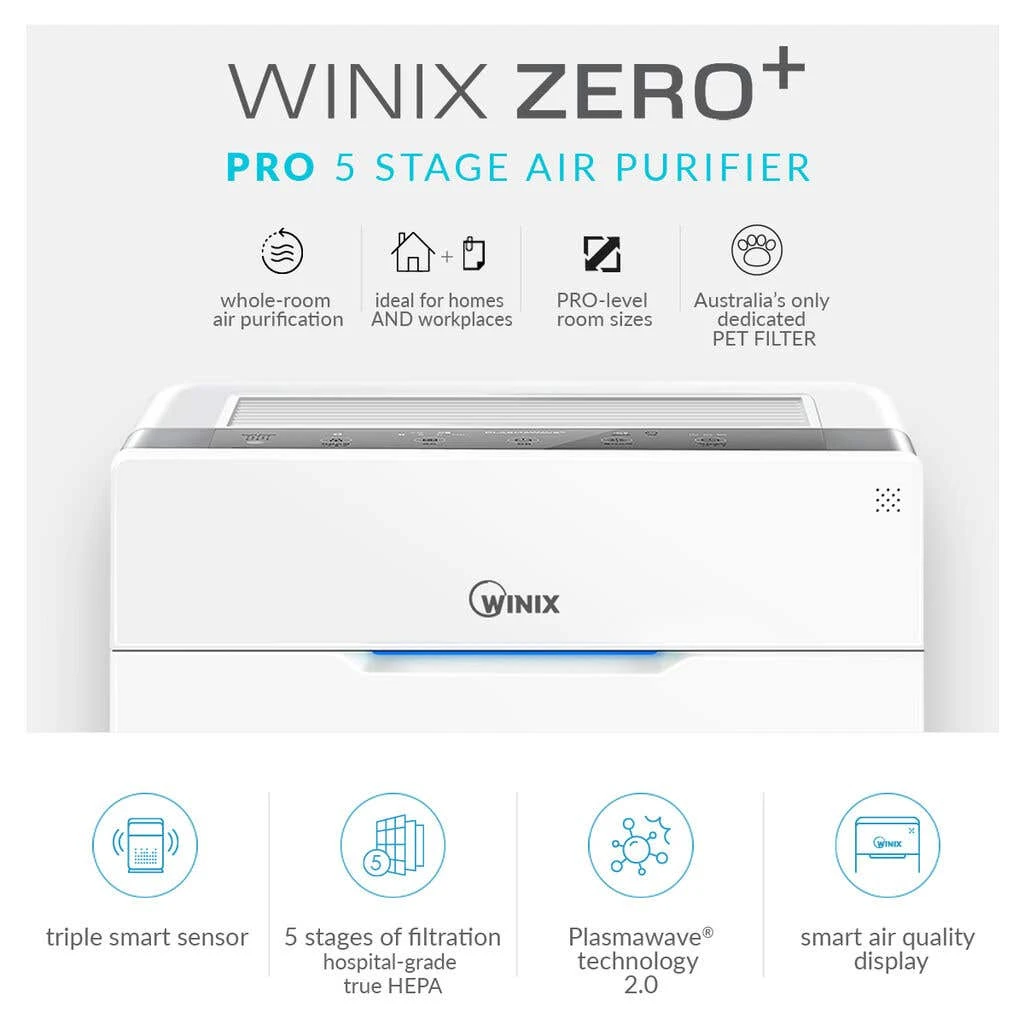 The next generation Zero+ PRO 5 Stage Air Purifier features 5 stages of air purification with PlasmaWave® technology, dedicated Pet Filter, reactive Triple Smart Sensor, Smart Air Quality Display, Sleep Mode and 4 Fan Speeds with Hospital Grade True HEPA filtration for whole rooms. Perfect for homes or professional workplaces and office use, the ultimate PRO level air purifier. Features 5 stages of air filtration, optimum room size up to 49.5 m², and Australian Hospital-grade True HEPA filter.
